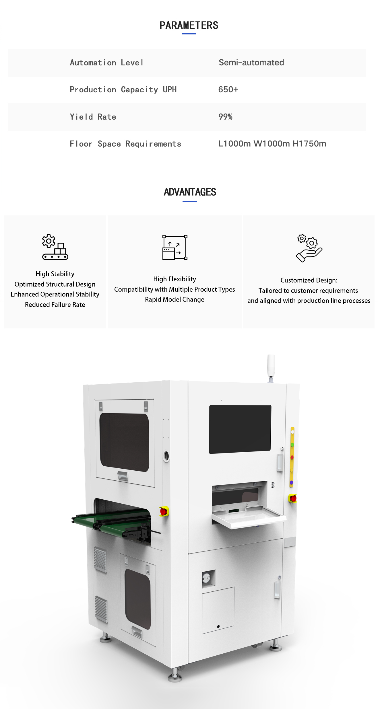 - Main functions of the equipment: Laser-engraved character detection, logo detection, label character detection, button color detection, lens character detection, printed pattern detection, OCR character recognition, weight verification, supports MES system integration